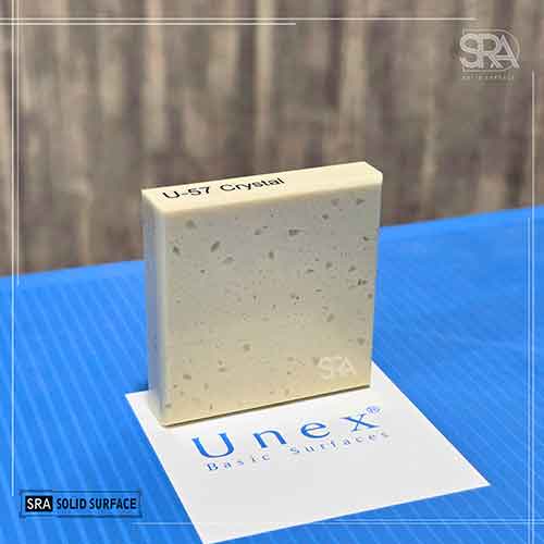 U-57 Crystal is a solid surface material that is made from acrylic and mineral fillers. It is available in 6mm and 12mm thicknesses. U-57 Crystal is a clear crystal color that is perfect for adding a touch of luxury to any space. It is also a durable and easy-to-care-for material that is perfect for countertops, vanities, and other high-traffic areas.